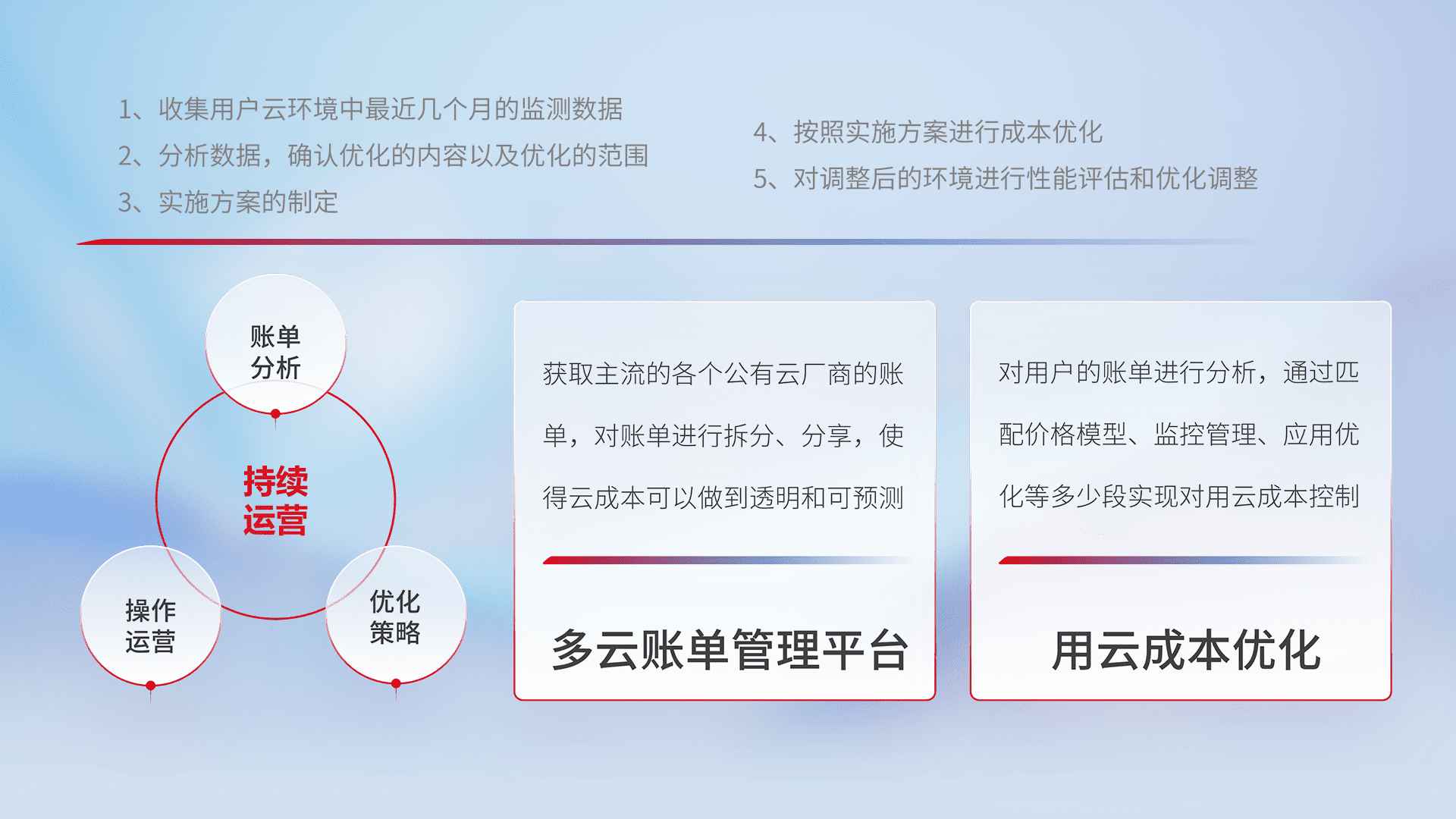 通过灵活运用多种自动化迁移工具,,帮助企业用户实现业务和数据高效 、、、稳定的上云迁移和云上迁移,,,,采用自研多云纳管平台,,,,以中立管理模式,,解决多组织、、、多云、、多运维厂商的复杂关系的管理,,保证多云平台资源配置的一致性,,,实时掌控云资源运行数据,,,运用智能化工具分析云资源多云平台的管理服务,,透明化管理成本支出,,,用云成本可预测、、、、用云费用可优化、、、云资源配额有据可依。。。